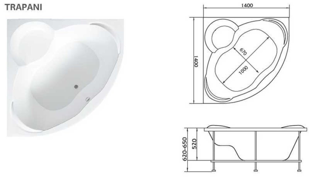 Угловая акриловая ванна Trapani с просторной симметричной купелью позволяет комфортно разместиться в ней даже вдвоем. На бортиках ванны предусмотрены места для крепления подголовников. Притопленное сиденье позволяет использовать его по прямому назначение, а также в качестве полочки для банных принадлежностей.