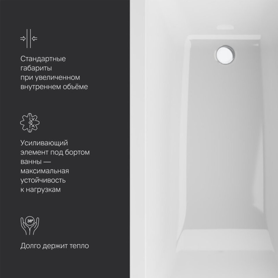Удобная спинка и оптимальные размеры ванной гарантируют полное расслабление и хороший отдых. За счет низкой теплопроводности и теплоемкости акрила ванна поддерживает температуру набранной воды. Товар соответствует самым высоким стандартам качества и безопасности.