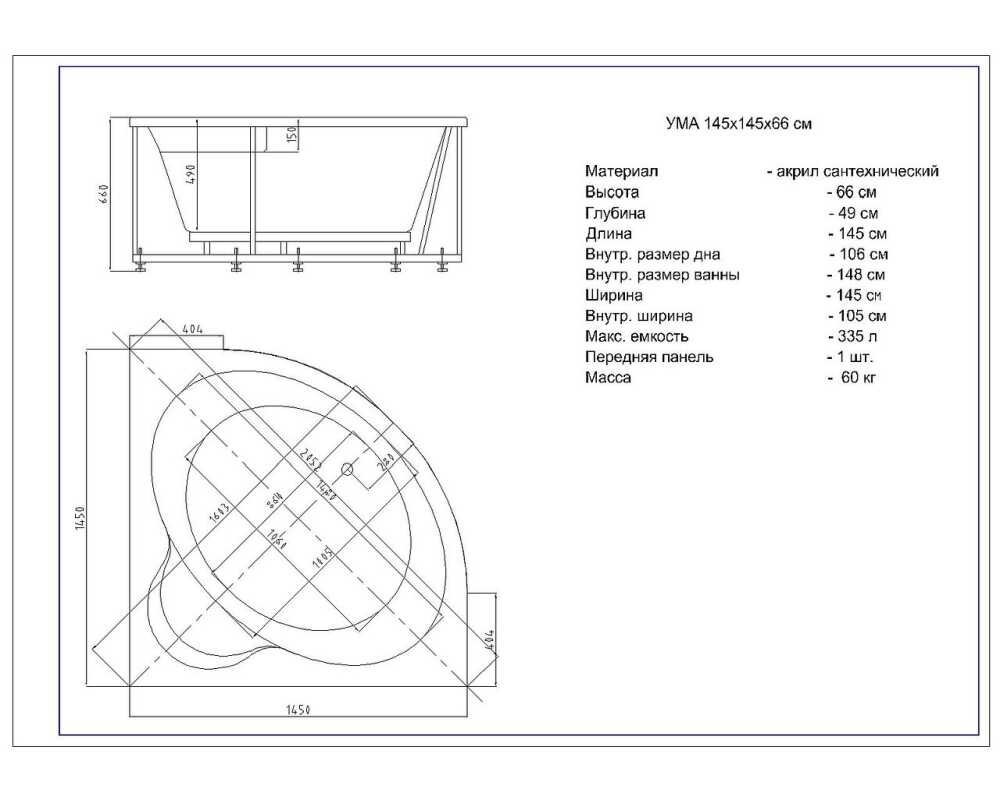 Акриловая ванна Aquatek Ума 145 x 145 см, цвет белый, UMA145-0000001