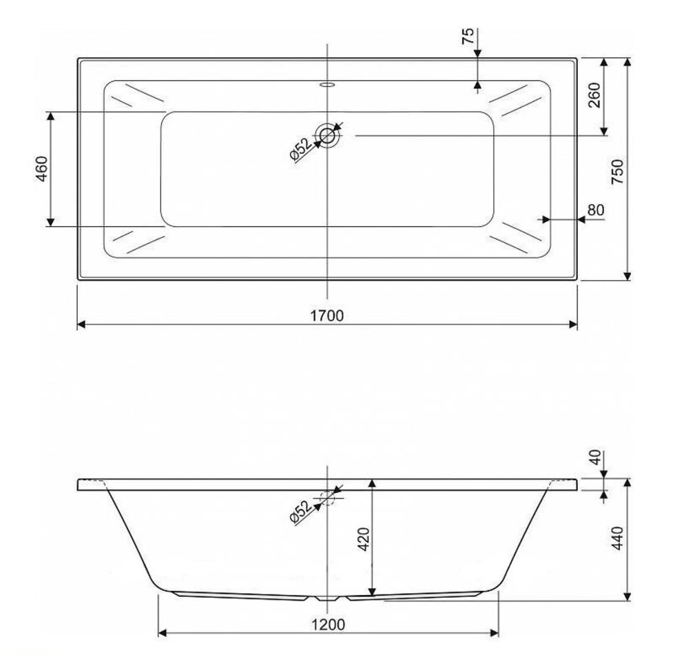 Акриловая ванна Cezares PLANE-170-75-45-W37 170 х 75 см