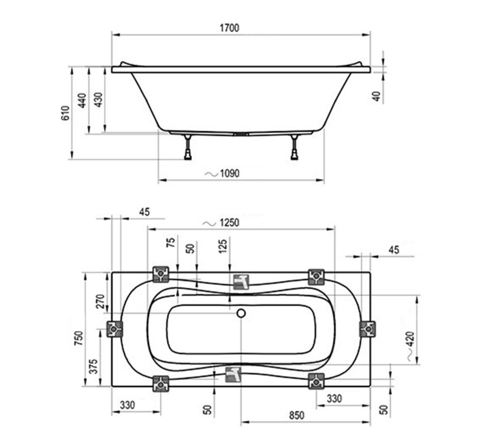 Пример стремления к совершенству – улучшенная ванна Campanula II с прямоугольным профилем и чашей, суженной по центру. Зоны для плеч и коленей стали объёмней, ступенчатый рельеф добавил чаше эргономичности и удобства.