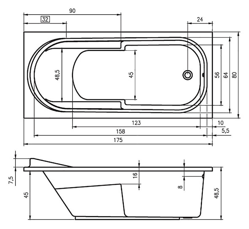 Акриловая ванна Riho Columbia 175 x 80 см, цвет белый, BA0400500000000