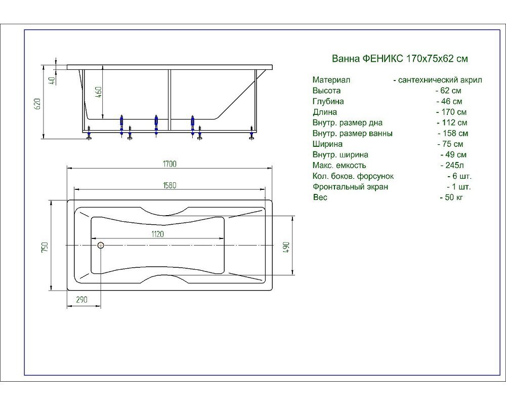Комплектация: ванна, фронтальный экран, каркас, слив-перелив.