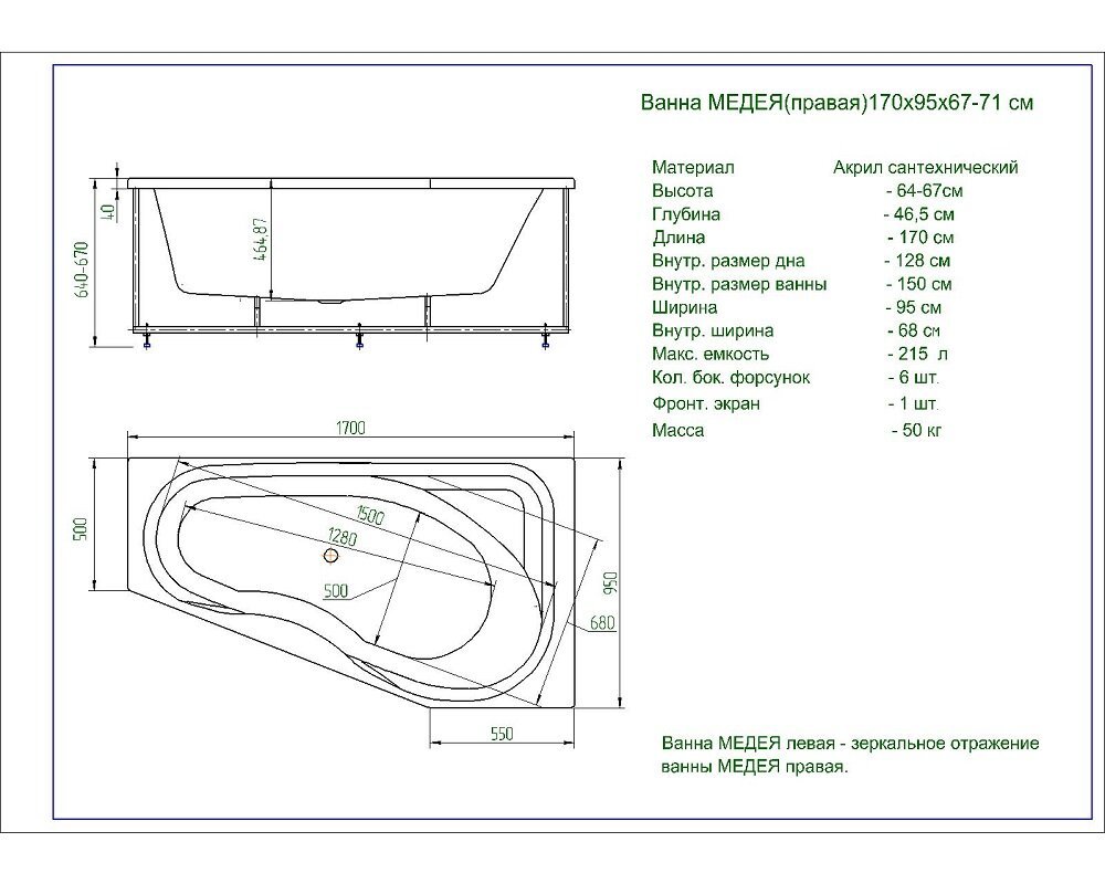 Комплектация: ванна, фронтальный экран, каркас, слив-перелив.