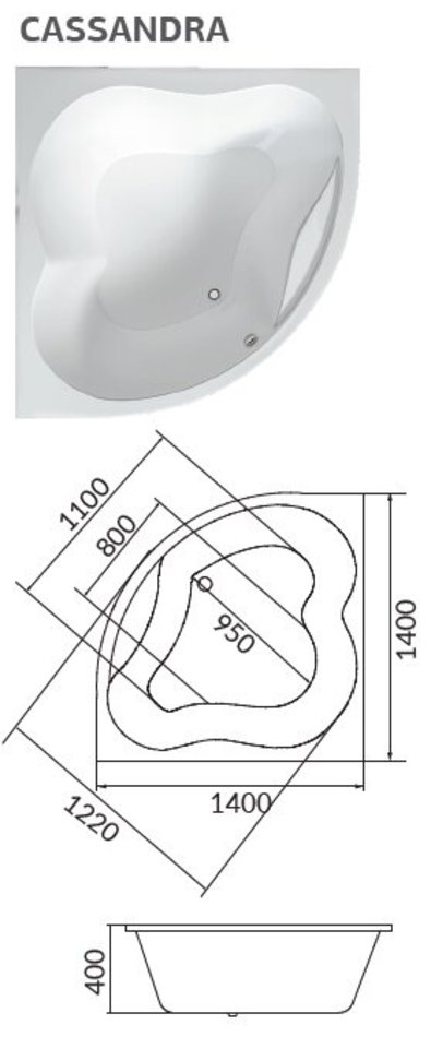 Интересная форма угловой гидромассажной ванны Cassandra не только придает ей оригинальность, но и дает вам целый спектр различных вариантов расположения в ней. Акриловая ванна Кассандра довольно компактная, что подтверждают ее габариты 140x140x63 см.