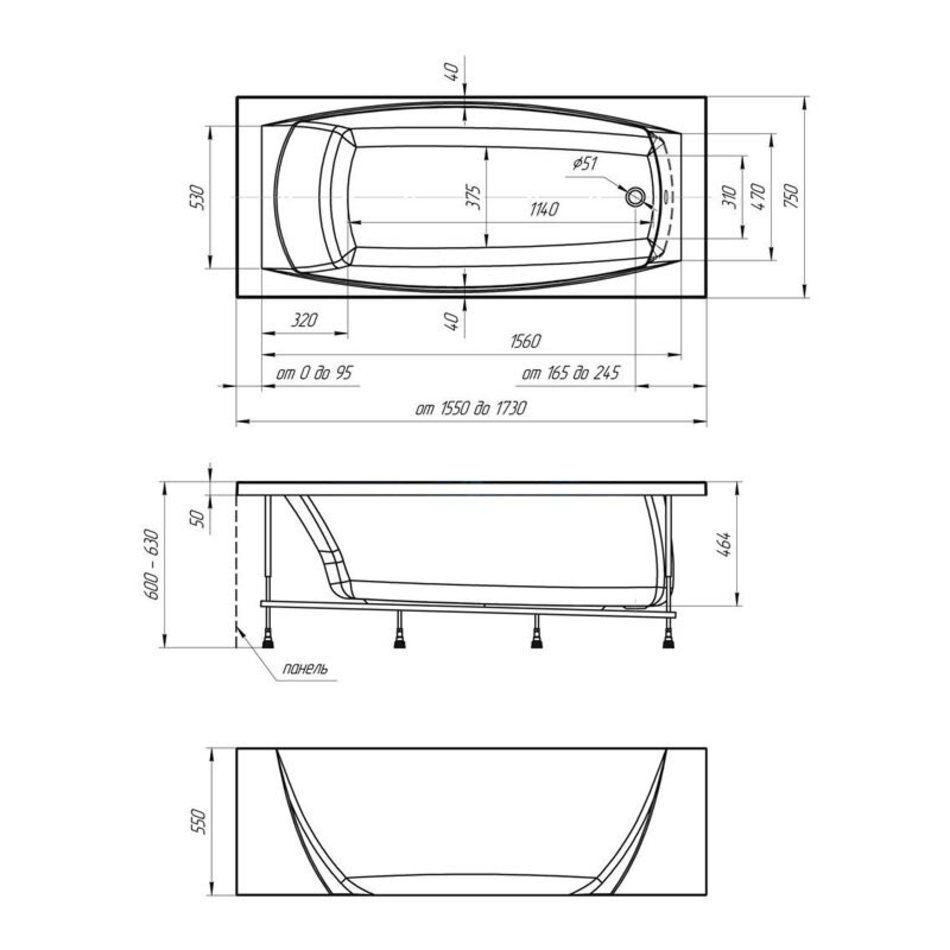 Ванна 1MarKa Pragmatika, прямоугольная, 173 x 75 см, подрезная от 155 до 173 см, цвет белый, 01пр17375