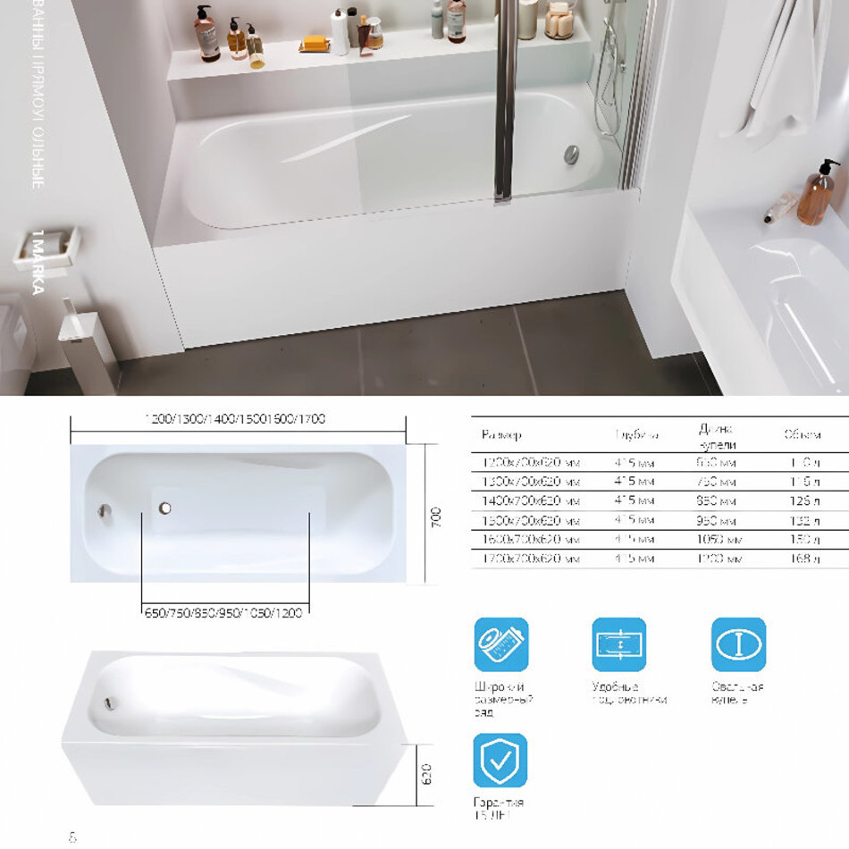 Ванна акриловая 130х70 см 1MARKA CLASSIC в наборе 4 в 1: Прямоугольная ванна, фронтальная панель, усиленный металлический каркас, слив-перелив хром 01кл1370Акп- благодаря широкому размерному ряду от 120 до 170 см подходит для размещения в любой ванной комнате.