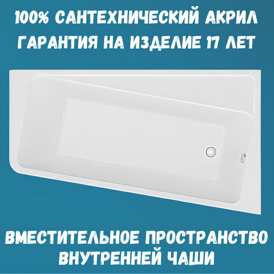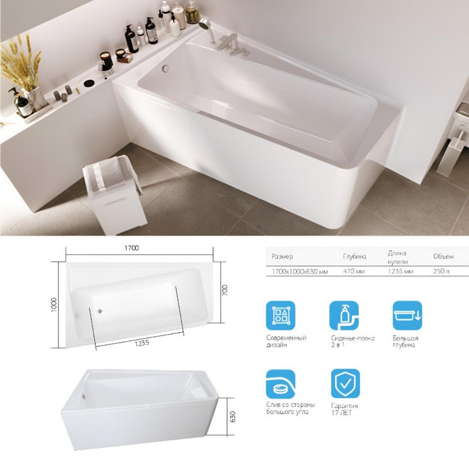 Ванна акриловая 1MarKa Direct 01дир1710лкп/01дир1710пкп, 170 x 100 см, левая/правая, цвет белый