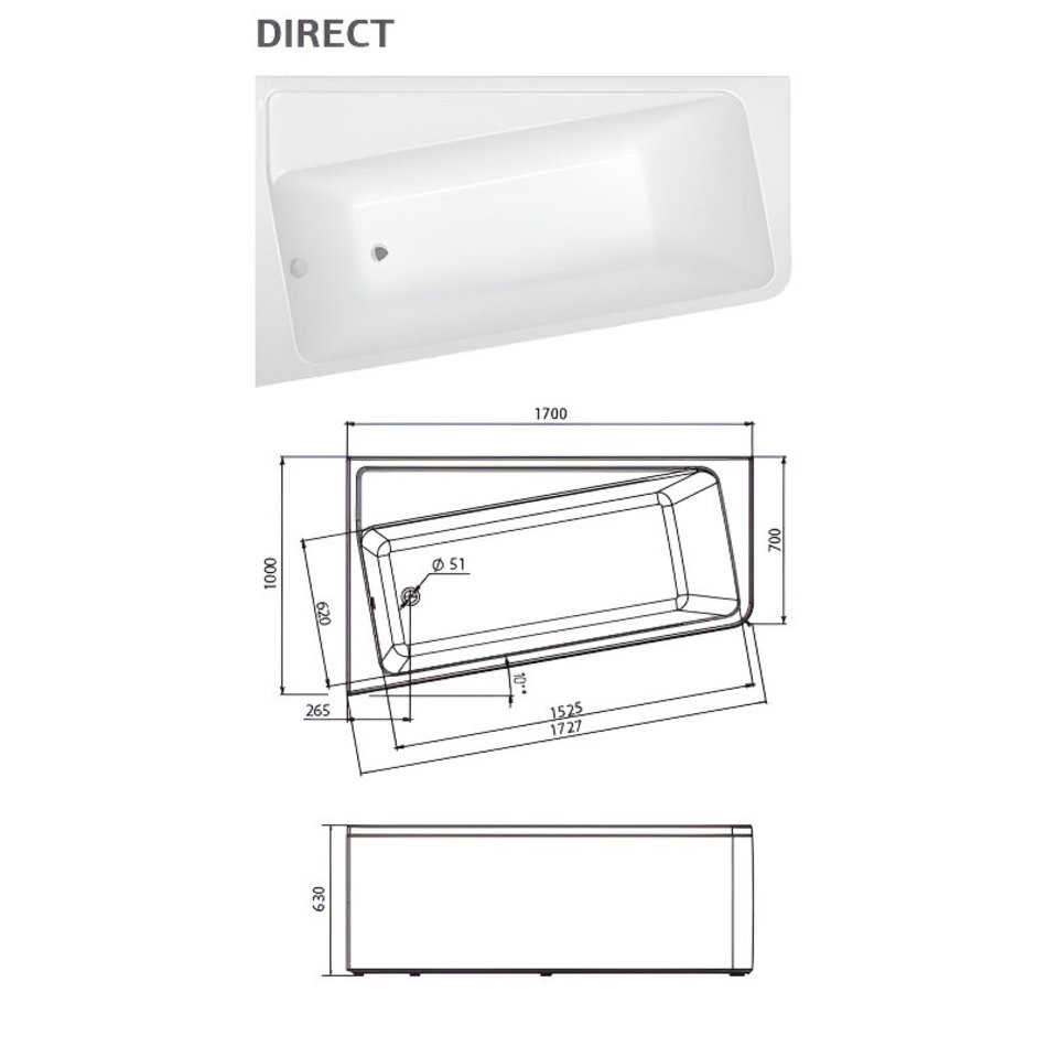 Ванна акриловая 1MarKa Direct 01дир1710лкс2+/01дир1710пкс2+, 170 x 100 см, левая/правая, цвет белый
