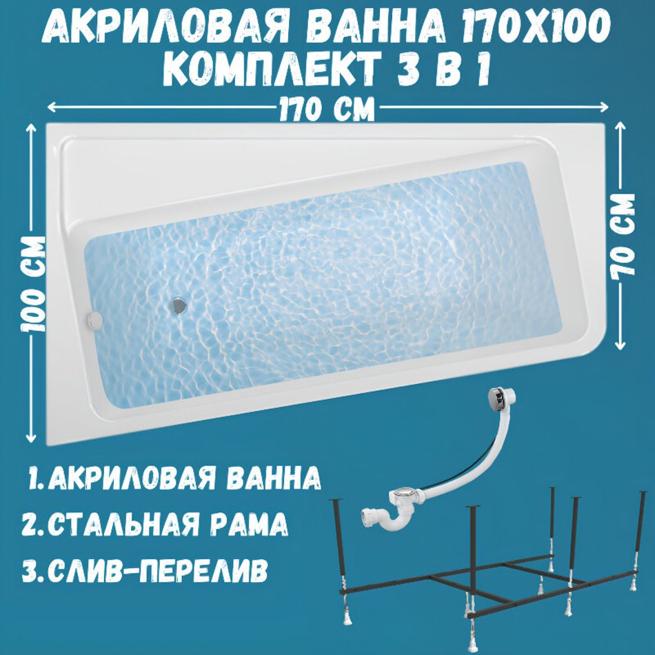 Ванна акриловая DIRECT 170х100 см, 100% сантехнический акрил, 1MARKA в наборе 3в1: Ванна акриловая, усиленная стальная рама, слив-перелив хром - это асимметричная модель, которая благодаря нестандартному положению купели превращается в полноценный уголок для комфортных ванных процедур.