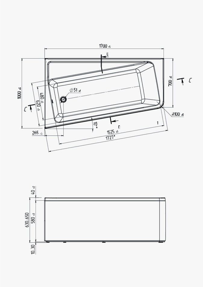 Ванна акриловая 1MarKa Direct, 170 х 100 см, асимметричная, левая/правая, 01дир1710л/п
