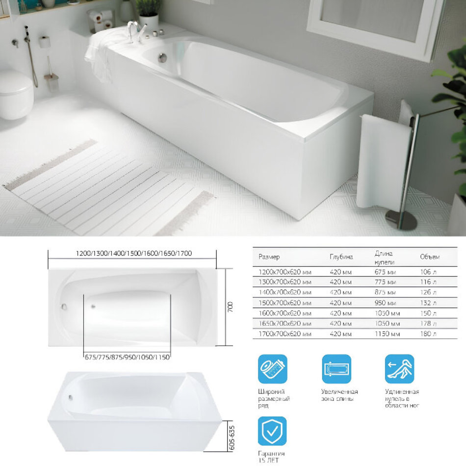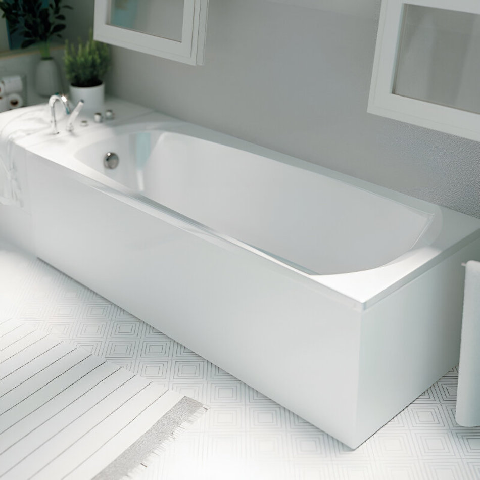 Ванна имеет прямоугольную форму, что позволяет установить ее в любом углу ванной комнаты. Съемная фронтальная панель и регулируемая высота ножек облегчают установку и обслуживание ванны.