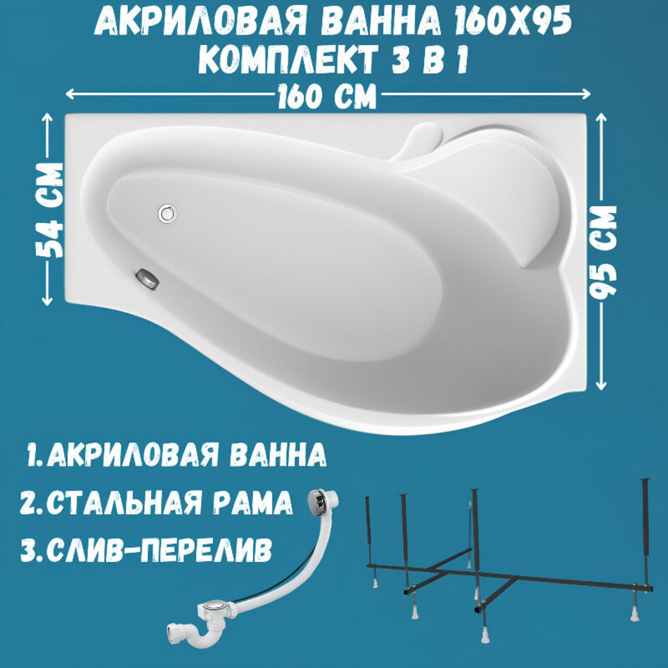 Ванна акриловая GRACIA 160х95 см, 100% сантехнический акрил, 1MARKA в наборе 3в1: Ванна акриловая, усиленная стальная рама, слив-перелив хром -уникальное сочетание комфорта и функциональности.