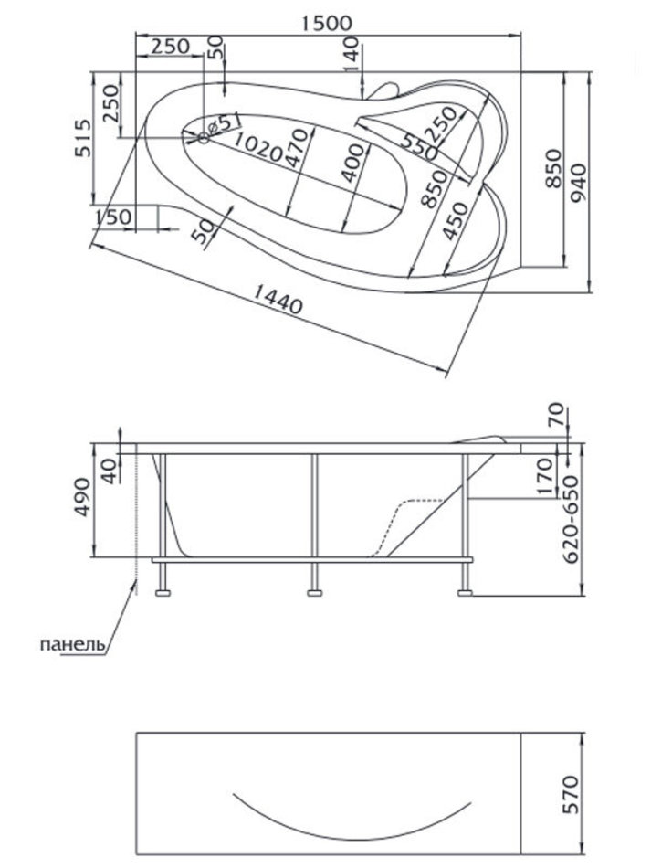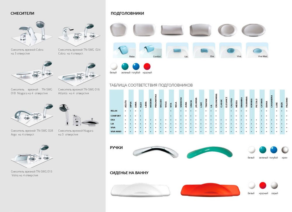 - Рама, слив-перелив, гидромассаж, подголовник, ручки, аэромассаж, подводная подсветка, хромотерапия: устанавливается.