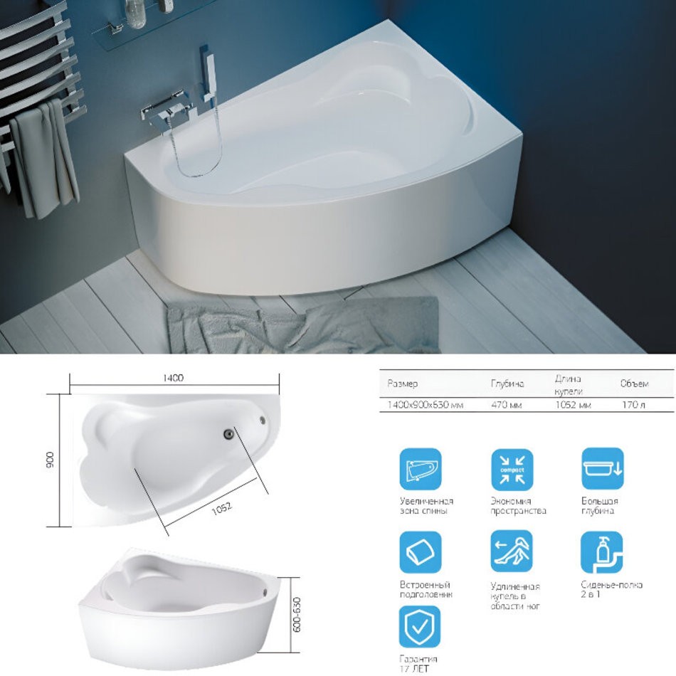 Ванна акриловая 1MarKa Lil 01лил1490лкс2+/01лил1490пкс2+, 140 x 90 см, левая/правая, цвет белый