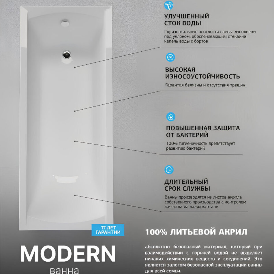 Комплект симметричной акриловой ванны «MODERN» с ножками, со сливом-переливом и панелью – готовое решение для ванной комнаты. Элементы, входящие в комплект, специально разработаны для данной модели. Это гарантирует идеальную совместимость и легкую установку.