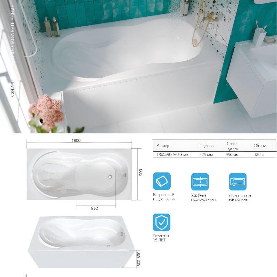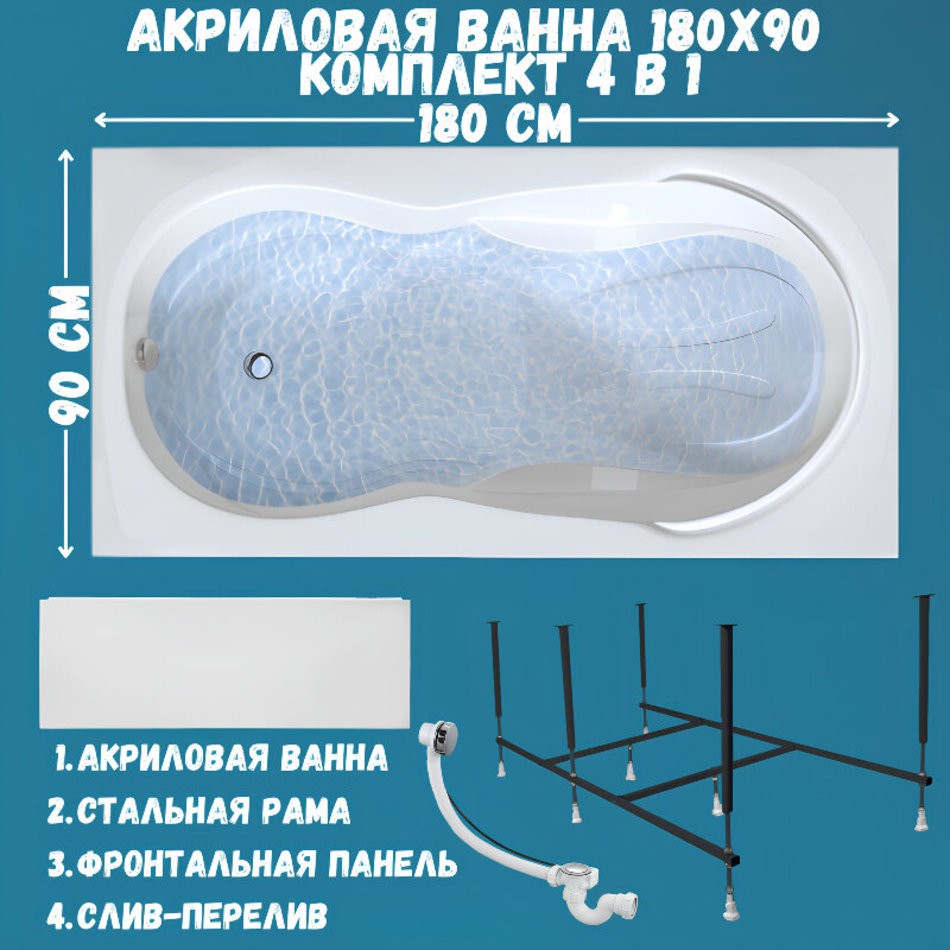 Ванна акриловая TAORMINA 180х90 см, 100% сантехнический акрил, 1MARKA в наборе 4в1: Ванна акриловая, панель фронтальная, усиленная стальная рама, слив-перелив хром 01та1890кп- это прямоугольная ванна с купелью в форме восьмерки, которая прекрасно дополнит как классические, так и современные ванные комнаты.