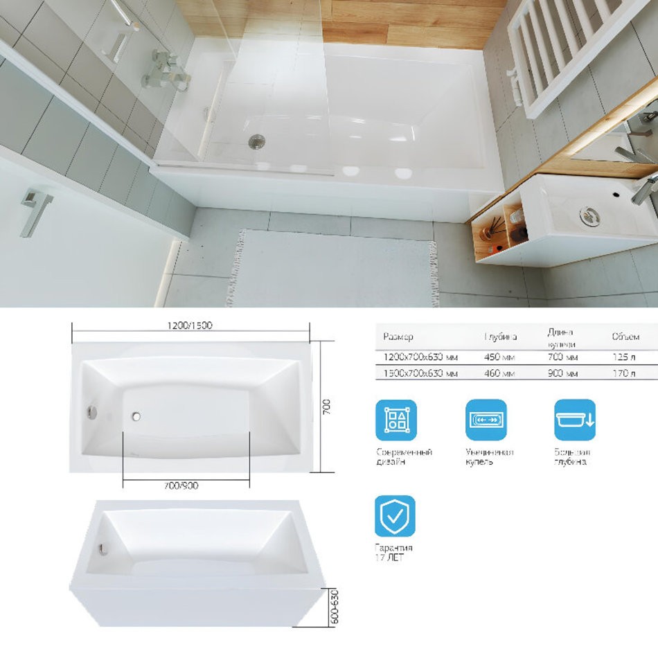 Ванна Marka One VIOLA имеет два размера - 120 и 150 см, что позволяет выбрать оптимальный вариант для вашего пространства. Объем чаши обеспечивает комфортное принятие ванны для одного человека.