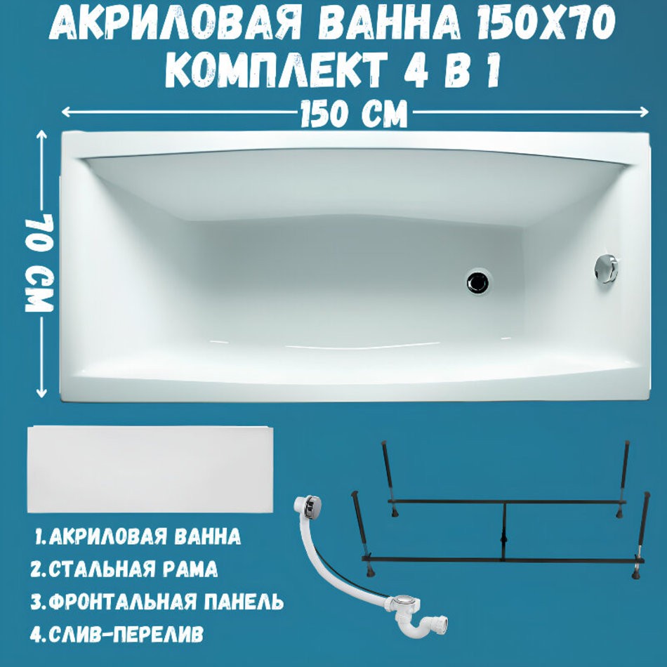 "Ванна акриловая 150х70 см 1MARKA VIOLA в наборе 4 в 1: Прямоугольная ванна, фронтальная панель, усиленный металлический каркас, слив-перелив хром 01ви1570кп-это комфорт и функциональность. Акриловая ванна Marka One VIOLA представляет собой прямоугольную ванну, которая станет отличным решением для небольших ванных комнат.