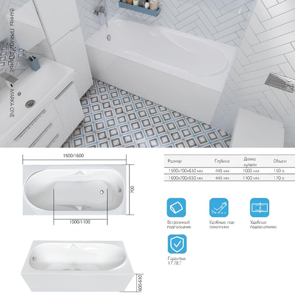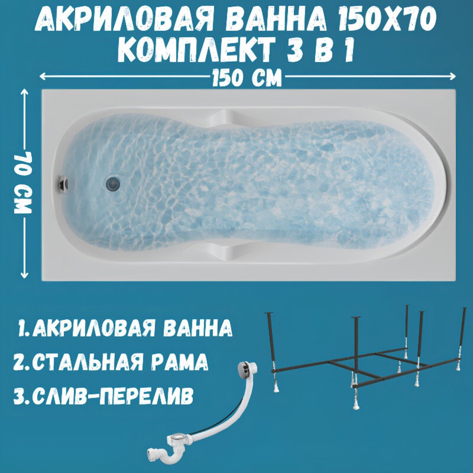 Ванна акриловая 150х70 см 1MARKA VITA в наборе 3 в 1: Прямоугольная ванна, усиленный металлический каркас, слив-перелив хром 01вит1570кс2+- это прямоугольная модель, которая обеспечивает высокий уровень комфорта при принятии ванны даже в небольших по площади пространствах.