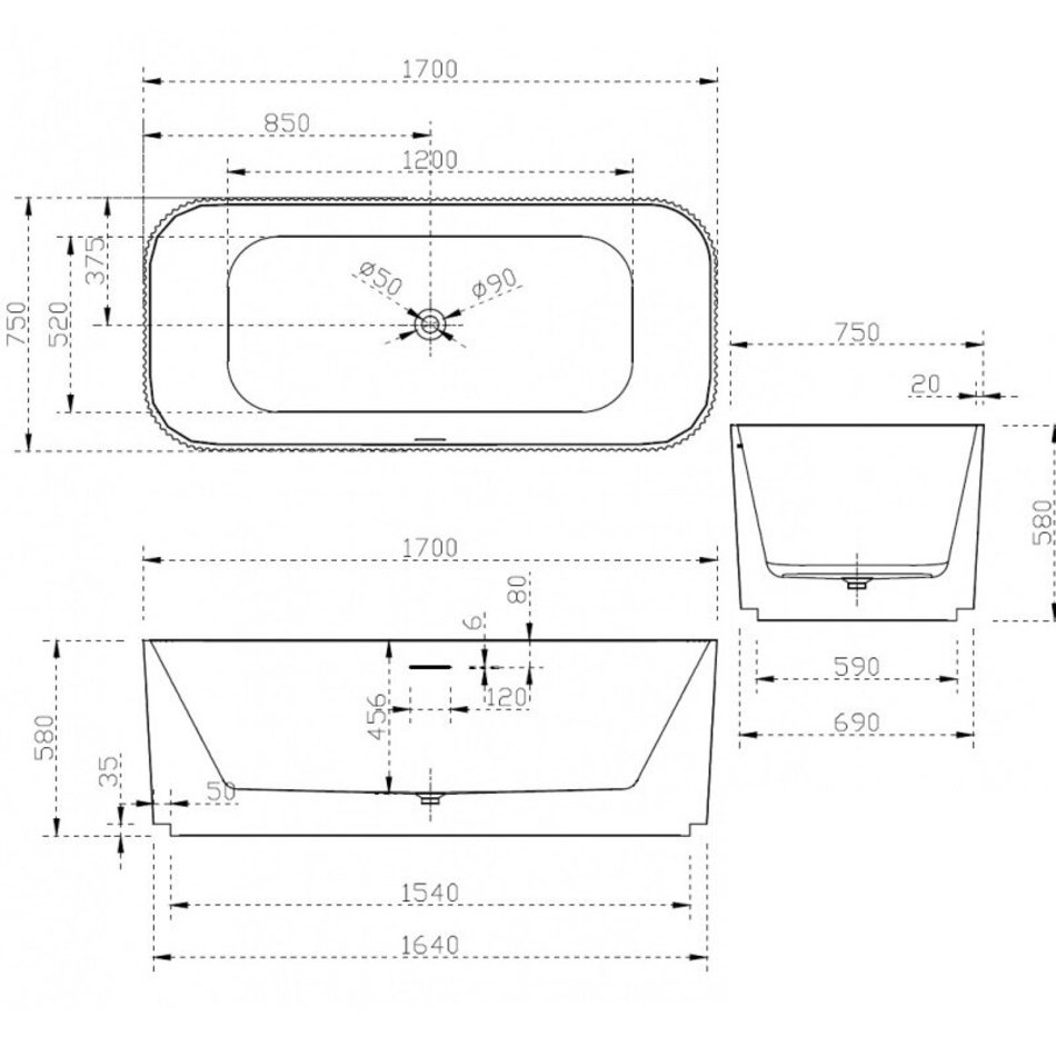 Ванна акриловая Abber 170 х 75 x 58 см, отдельностоящая, белая, AB9363-1.7