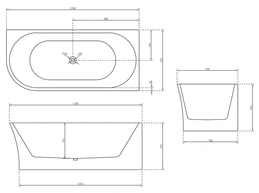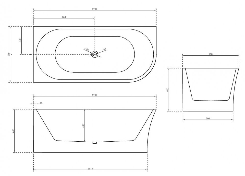 Ванна акриловая Abber AB9257-1.7 L/R 170 х 78 x 60 см без гидромассажа, пристенная, белая, левая/правая