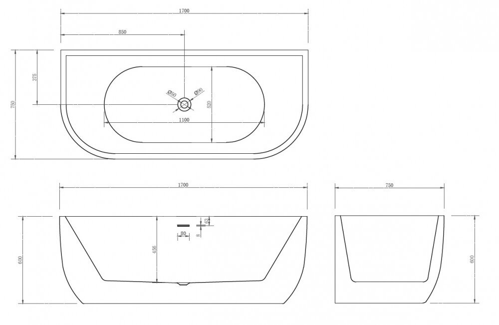 Ванна акриловая Abber AB9316 170 х 75 см, пристенная, белая