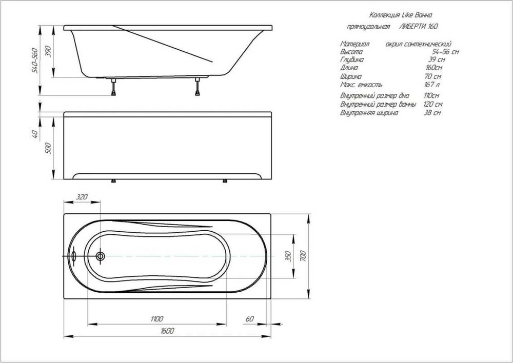 Ванна акриловая Aquatek Либерти Lifestyle 160 x 70 см, белый, BER160-0000001
