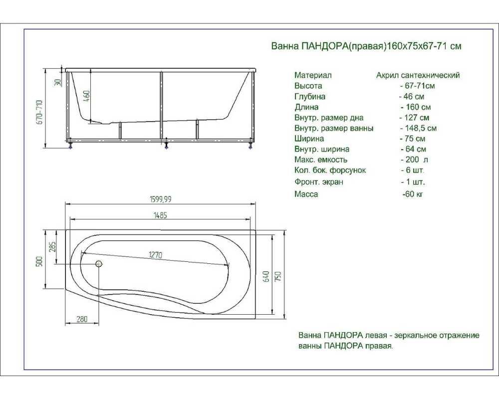 - Возможна установка системы гидромассажа, аэромассажа, ароматерапии, подводной подсветки, хромотерапии, системы дезинфекции