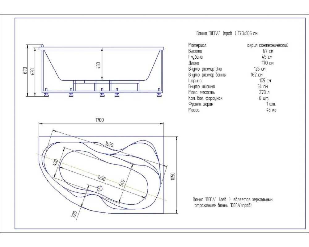 Ванна акриловая Aquatek Вега 170 x 105 см с фронтальным экраном, вклеенный каркас, белая, левая, VEG170-0000066