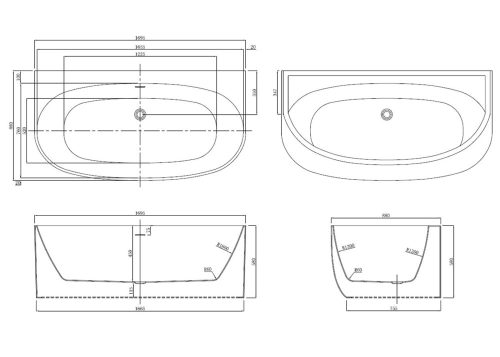 Ванна акриловая Azario Cambridge CAM17289MB 169.5 х 88 x 58 см пристенная, черный матовый