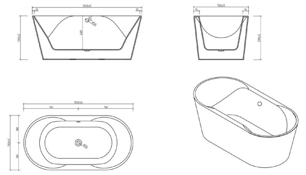 - Отдельностоящая, овальная акриловая ванна в комплекте со сливом-переливом цвета хром и каркасом