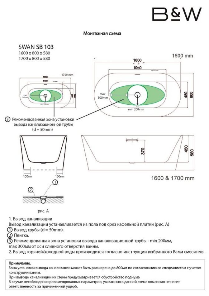 Ванна акриловая Black&White Swan SB103, 170 х 80 см