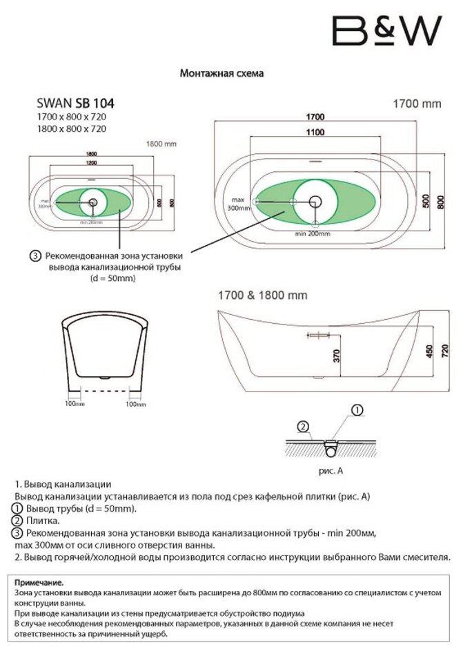 Ванна акриловая Black&White Swan SB104, 180 х 80 см