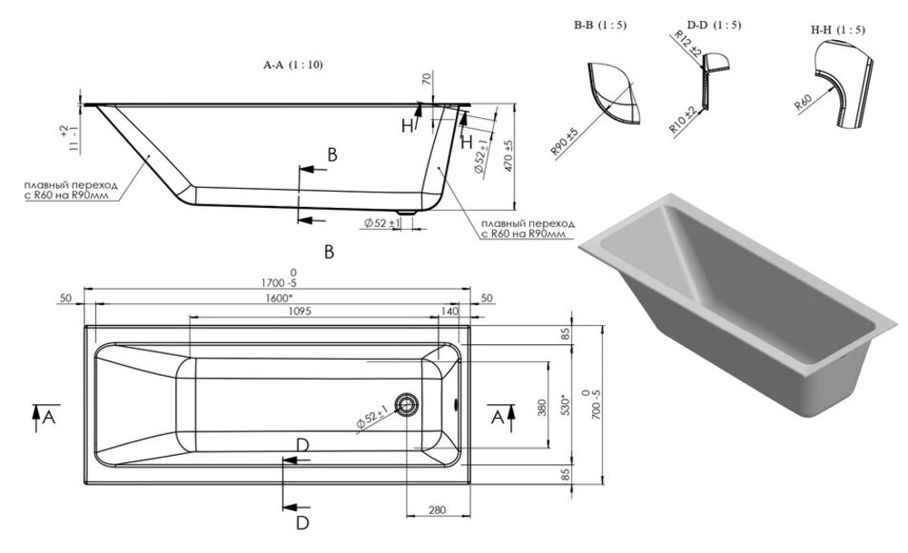 Ванна акриловая Cersanit Crea A64870, 170 x 70 см, белый