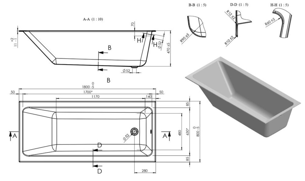 Ванна акриловая Cersanit Crea A64873, 180 x 80 см, белый