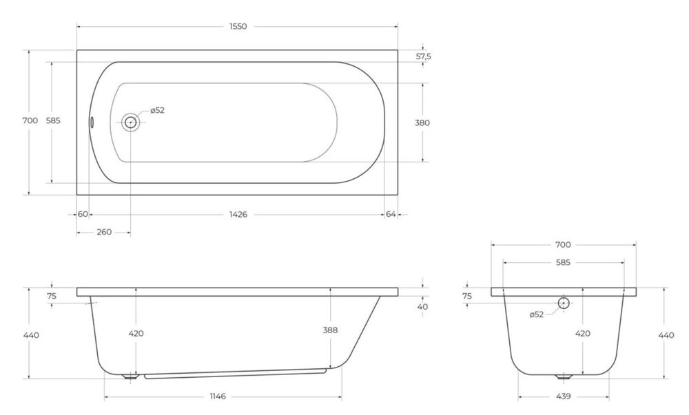 Ванна акриловая Cezares Eco-155-70-41-W37, 155 x 70 см, белый