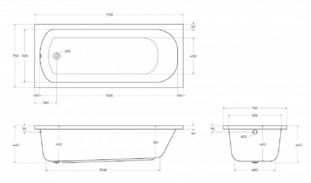 Ванна акриловая Cezares Eco-175-75-41-W37, 175 x 75 см, белый