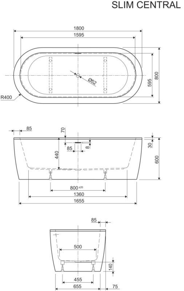 Ванна акриловая Cezares Slim Central, 180 х 80 см, отдельностоящая, черная фронтальная панель, чаша белая, SLIM CENTRAL-180-80-60-NERO-SET
