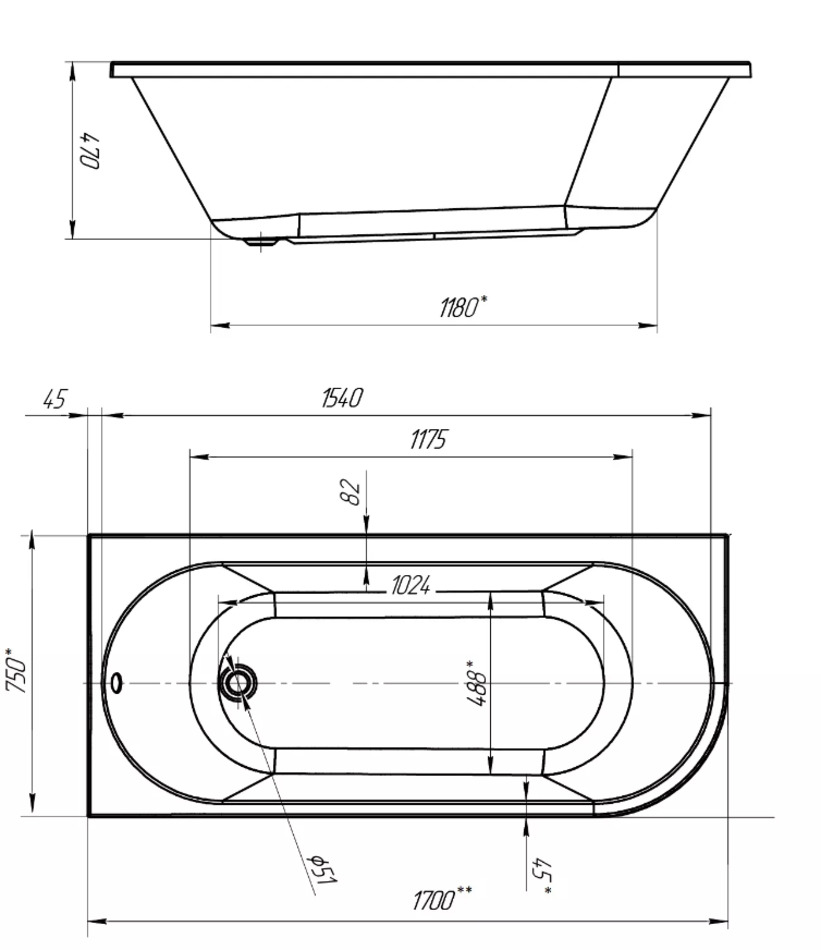 Ванна акриловая Creto Melissa 32-17075L/32-17075R, 170 x 75, левая/правая, белый
