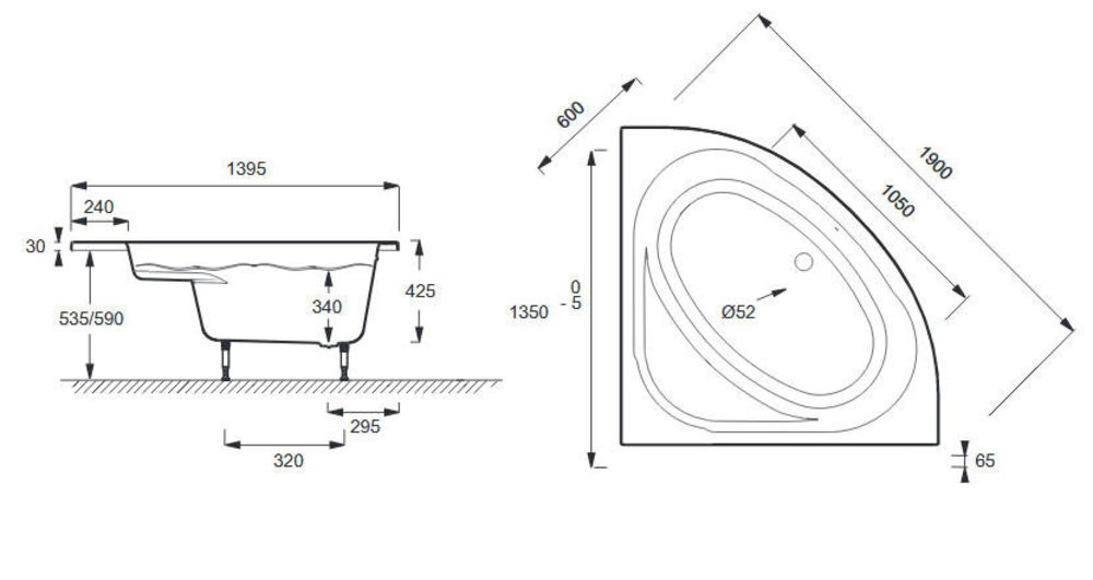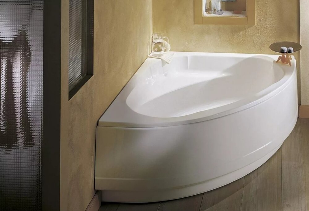 Угловая акриловая ванна 135 х 135 см с регулируемыми ножками, комплекте с рамой и панелью.