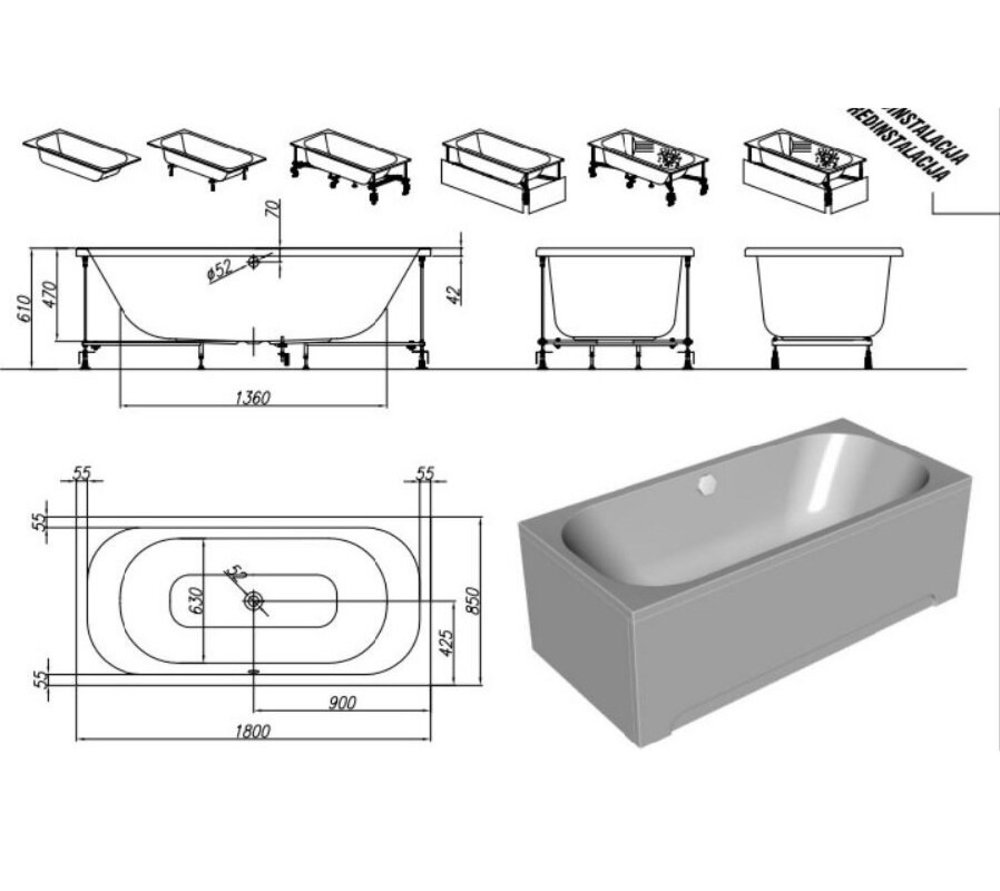 Собранная ванна на каркасе, со сливом-переливом ALCA PLAST, в индивидуальной брендированной картонной коробке с усилением. Вся ванна выполнена в белом глянцевом цвете.
