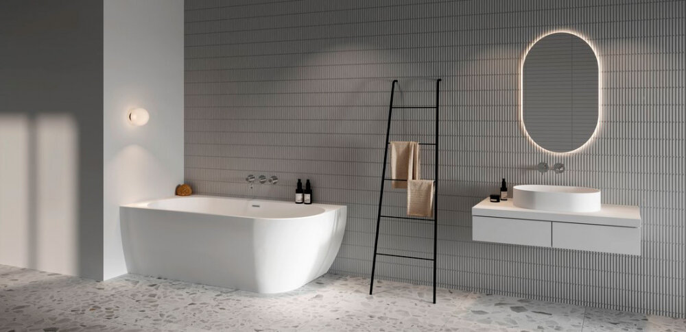 Сочетает в себе преимущества асимметричной и отдельностоящей ванны.