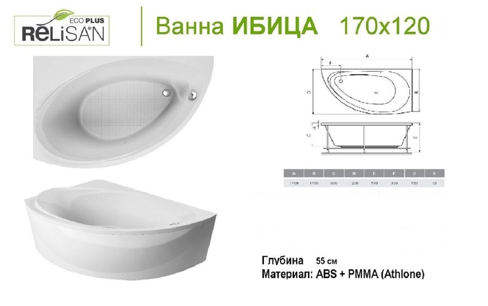 Ванна акриловая Relisan Eco Plus ППУ Ибица 170 х 120 см, L/R