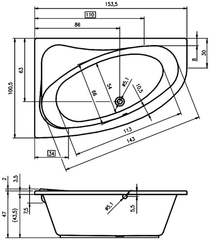 Ванна акриловая Riho Aryl 153 x 100 см, цвет белый, левая/правая