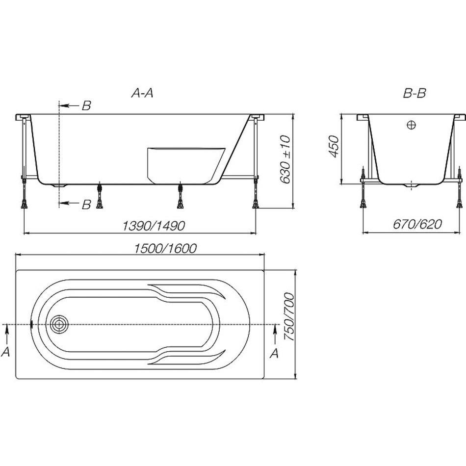 Ванна акриловая Roca Genova ZRU9302894/ZRU9302895, 150 х 75 см, с монтажным комплектом, цвет белый