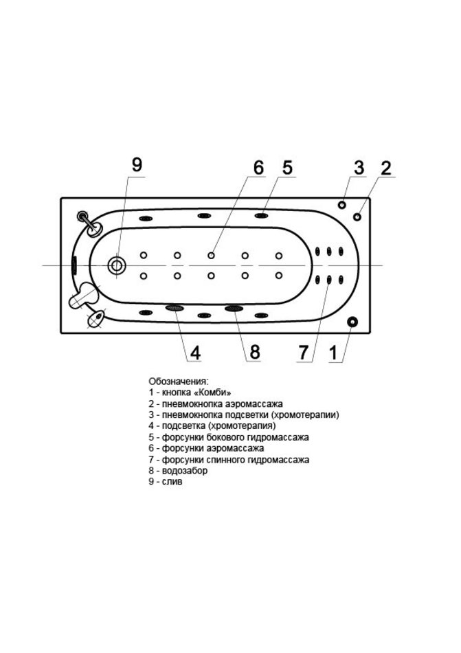 Гидромассаж пневматическое управление. Премиум форсунки хром 6 шт. (Sirem Франция) Фронтальная панель и слив-перелив в комплекте