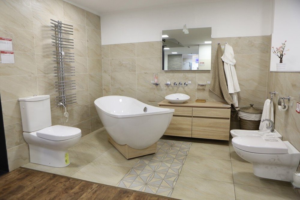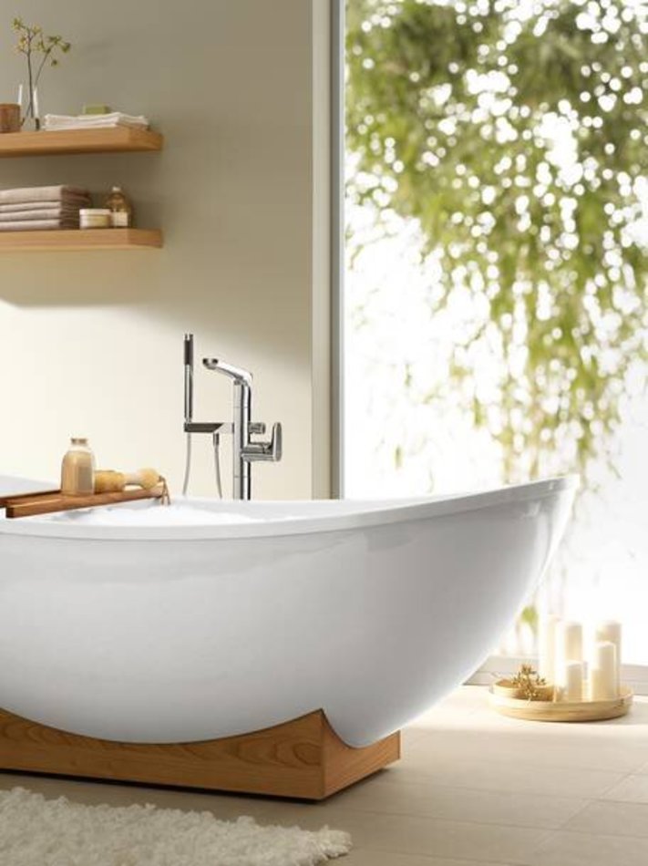 Красивая ванна с небольшой деревянной консолью из вяза и хромированным сливом-переливом.