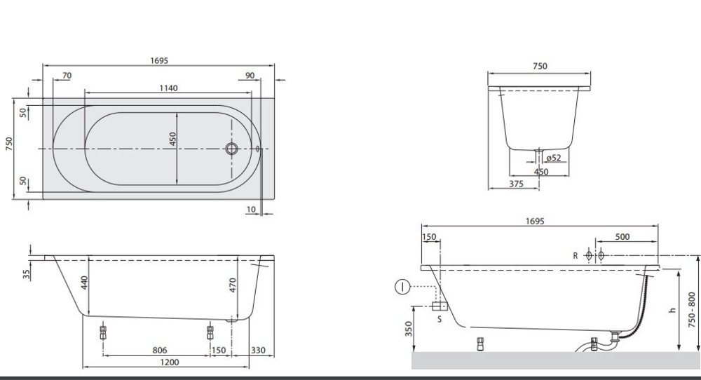 Ванна Villeroy&Boch O.novo UBA170CAS2V-01 Solo 170 x 75 см в комплекте с ножками, alpin
