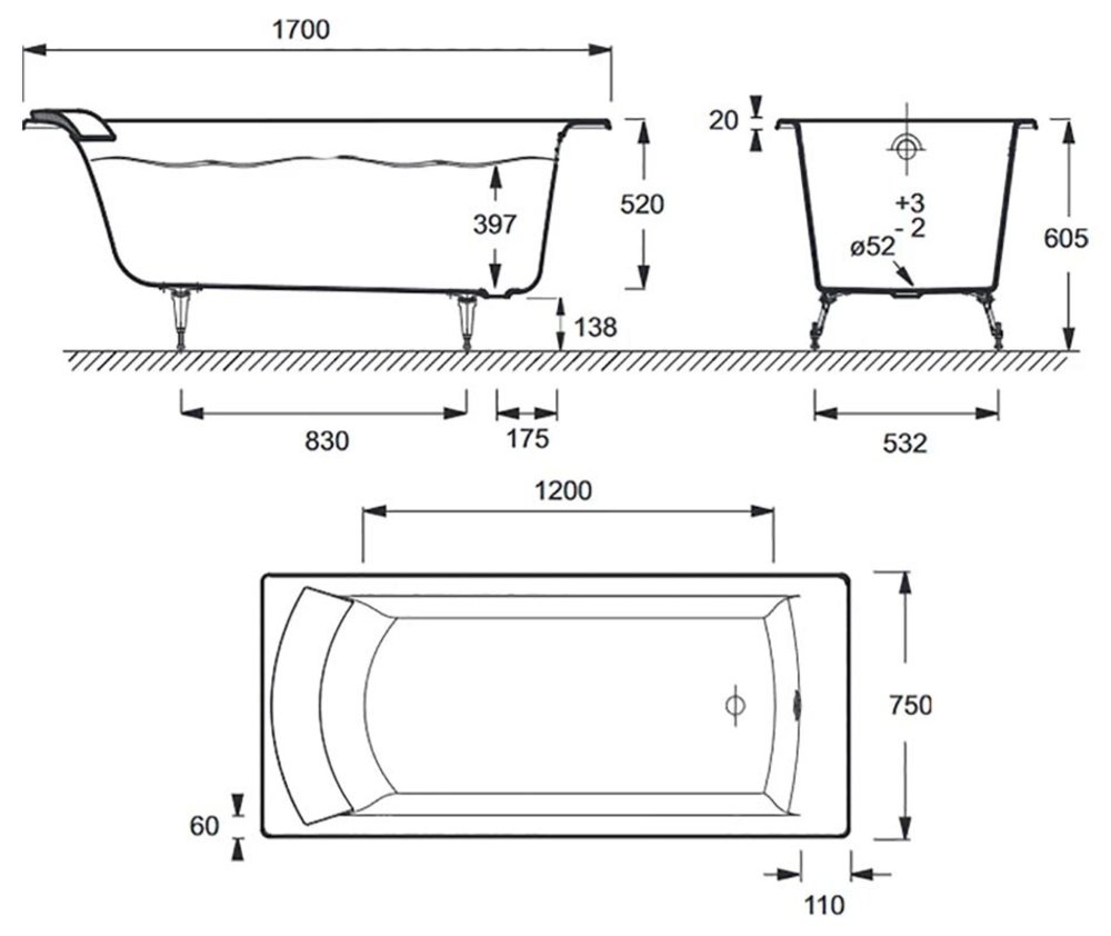 Чугунная ванна Jacob Delafon Biove, 170 x 75 см, без отверстий для ручек и антискользящего покрытия, ножки и слив-перелив в подарок, E2930-S-00